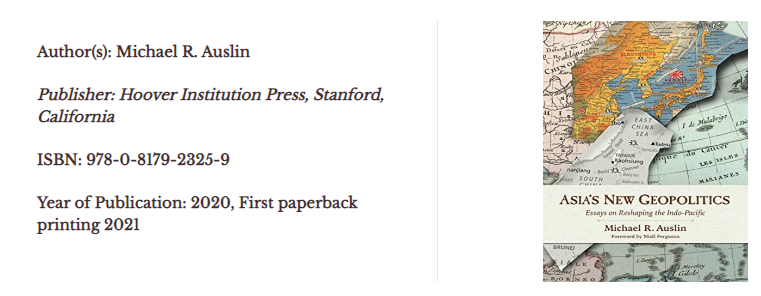 In the book “Asia’s New Geopolitics: Essays on Reshaping the Indo-Pacific”, the author, Michael R. Auslin, who is a world-renowned expert on Indo-Pacific region, Research Fellow in Contemporary Asia at Hoover Institution, Stanford University, a historian by training, who specialises in US Policy in Asia and geopolitical issues in Indo-Pacific region, examines the key issues that are changing the balance of power in Indo – China and globally and China’s aggressive global policies and strategies and its attempts to bend the world to its wishes.