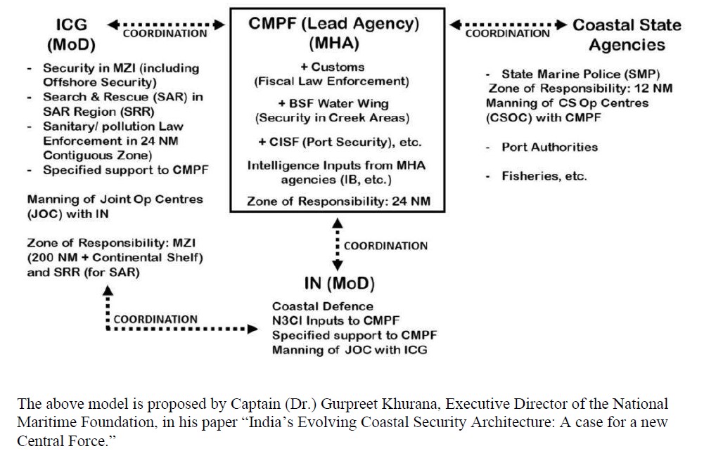India has a vast coastline of 7516.6 km bordering the mainland with 13 states & UTs situated on the coast and 1,197 islands. A Coastal Security Scheme (CSS) has been implemented by the Department of Border Management, MHA in phases since 2005 with the objective of structuring & strengthening the Coastal Police force infrastructure for patrolling & surveillance of coastal areas with the three-layered security apparatus of Indian Navy, Indian Coast Guard & State Coastal Police forces working towards securing the Coast. But to achieve greater operational efficiency & heightened vigilance, the MHA had mulled over the idea of having a Central Marine Police Force with its own cadre, manual & act to be headed by a DG Rank officer as early as 2016. The proposal gathered steam after inputs of Pakistan-based terrorist groups targeting critical infra. along the West Coast was received, on 19th July 2016 the then Home Minister Shri. Kiren Rijiju had responded affirmatively to a question on creation of CMPF in the Lok Sabha and the suggestion for the same had been made by then Maharashtra CM Shri. Devendra Fadnavis in a meeting held on June,16, 2016. The Proposed CMPF has so far not been created and debates around its raising have also gathered attention of masses, as per media reports CMPF could be on the lines of CRPF as the latter does not have power to investigate cases so the raising of CMPF would work as an additional security wing to investigate cases under sec.157 CrPC which had otherwise been left to the discretion of State Police Forces. In Akhilesh Prasad vs. UT of Mizoram AIR 1981, SCR (2) 789 it was held that The Central Reserve Police Force squarely falls within the expression "Armed Forces of the Union" as used in sub-section (2) of section 197 of the Code of Criminal Procedure thus restricting the powers of CRPF but the creation of CMPF could fill the void by having the powers of investigating cases on a fair basis without relying on State Government Sanction. The Public Accounts Committee of the Parliament in 2020 observed that the Territorial Waters, Continental Shelf, Exclusive Economic Zone and Other Maritime Zones Act, 1976 -- which is implemented by the Ministry of External Affairs does not designate any authority that can investigate and arrest individuals and seize vessels that undertake any criminal or anti-national activity, so it favoured for more empowerment & strengthening of ICG in its report. While countries like U.S. have specialized agents in Coast Guard Investigative Service (CGIS) that authorizes them to take up Criminal Investigations in Maritime realm, we lack in this critical area.