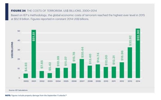 A theoretical myth that is often committed is viewing terrorism as a political weapon. A deeper look into the subject reveals that the impact of terrorism is more economic than political. Especially in democracies like India, terrorism may shake the foundation of democracy a little but it would take a lot more than that to completely uproot the political structure. What terrorism does successfully though is instil fear and uncertainty and hatred among people and as a result, dampen the economy. World Economic Forum calculated the cost of terrorism to the world to be $52.9 billion in 2014, the highest since 2001, according to the new 2015 Global Terrorism Index. The calculation accounts for the direct (and some of the indirect) costs of terrorism, and is conservative in its approach