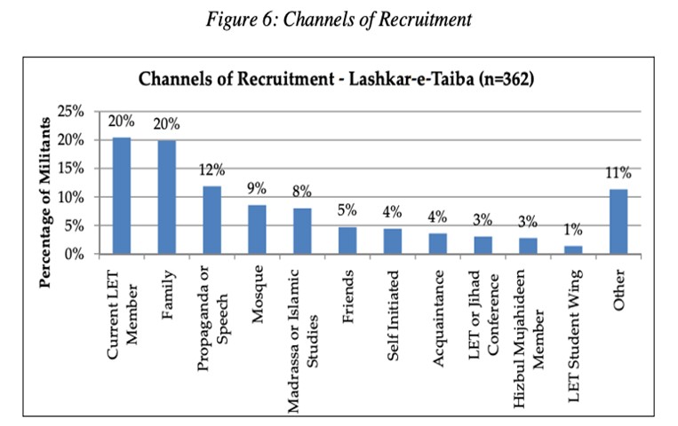 Out of several channels of recruitment (Fig. 6)xxxv, mosques and madrassas are the two popularly misused to spread extremist propaganda. Madrassas in Pakistan run by these groups are funded by external donors such as Pakistani and Kashmiri businessmen, while also being heavily funded by Saudi Arabia.xxxvi While 57% of LeT militants were found to have attended madrassas xxxvii ; these institutions have acted as catalysts in promoting jihad and building a toxic network of hysterical militants driven by vengeance and bitter resentment against the enemy.