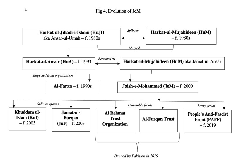 JeM aka Tehreek-e-Khudam-ul Islam aka Tahreik-e-Furqan was formed as a sub-splinter of HuJI which initially splintered into Harkat-ul-Mujahideen (Fig.4). These two groups merged to form Harkat-ul-Ansar in which Azhar served as the General Secretary in 1994. After being designated as a terrorist organisation by the US, HuA was renamed as Harkat-ul-Mujahideen which broke into Al Farhan and JeM. In 2003, JeM split into Khuddamul-Islam headed by Azhar and Jamat ul-Furqan headed by Abdul Jabbar (JeM’s former military operations commander). JeM also founded charitable trusts such as the Al Rehmat Trust Organisation and Al Furqan Trust for fundraising purposes; and a proxy militant group named People’s Anti-Fascist Front (banned by India in 2023) which aids the organisation in conducting arms trade, civilian killings and recruitment,xi and shares affiliations with Jammu and Kashmir Ghaznabi Force, an offshoot of LeT.xii