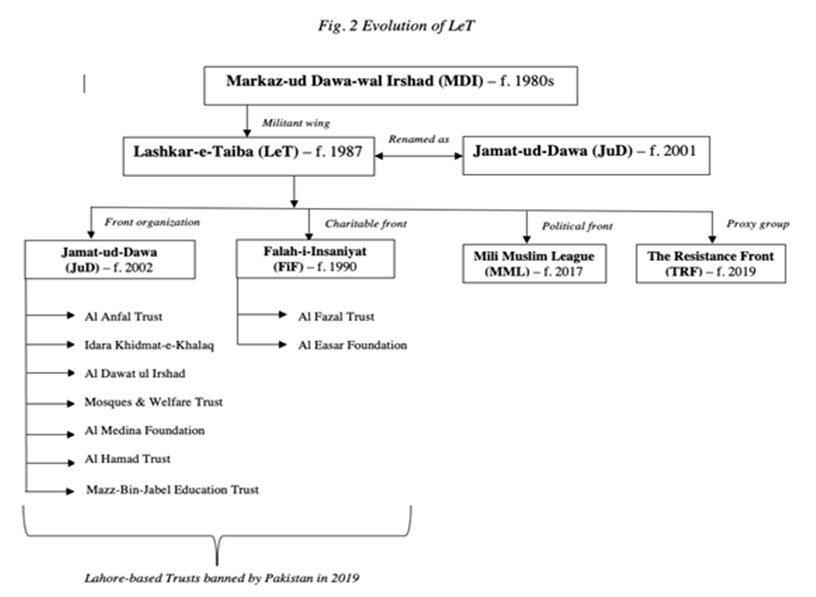 LeT was established as a militant wing of Markaz-ud Dawa-wal-Irshad (MDI), a Pakistan-based social welfare organisation (Fig. 2).ivLeT formed a front organisation known as Jamaat-ud-Dawa (JuD) and a charitable wing named Falah-i-Insaniyat Foundation (FiF). Whilst LeT focuses on jihad and violent extremism, JuD focuses on dawa (outreach through non-violent extremism) and, FiF focuses on dua by raising funds for charity and providing humanitarian assistance. After being banned by Pakistan in 2002, LeT renamed itself as Jamaat-ud-Dawa and continues to operate under the banner of a social welfare organisation.v In 2017, it rebranded itself as Tehreek Azadi Jammu and Kashmir, and in the same year established its political front Mili Muslim league. Although this party remains unrecognised by the Pakistani election commission, it participated in the 2018 general elections with the aim of moulding Pakistan into a “real Islamic and welfare state,” and has also shown resolute support to the development of the China Pakistan Economic Corridor.vi