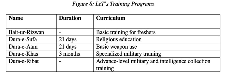 The training programmes of these groups are holistically planned, having the components of professional military training and weapon usage; and religious, intelligence and civic education including lessons about the Kashmir conflict, India’s demography and security agencies. Training is also provided on gathering intelligence, conducting reconnaissance activities and spreading propaganda to recruit more militants.xlii LeT has been regarded as one of the finest militant training providers due to its efficacious training plans (Fig. 8),xliii allowing it to attract other terrorist groups to undertake training for their own cadres.xliv