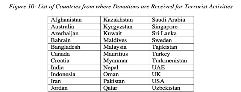The Pakistani diaspora and businessmen based in foreign countries heavily fund these organisations legally through charitable foundations,liv which are then diverted into militant activities; meaning various donors from across the world knowingly and unknowingly aid in proliferating terrorism (Fig. 10). Saudi Arabia’s extremist Salafi-Wahhabi followers and powerful business tycoons have funded thousands of madrassas in Pakistan which have remained the lifeline of promoting jihad and training militants.lv Adding to this, Rtd DGP of Maharashtra and former IPS Officer Praveen Dixit suspects that although the support from Saudi Arabia has reduced over the recent years due to India’s proactive diplomatic efforts in mending ties, the support for these groups from Turkey, Afghanistan and Iran is on the rise.