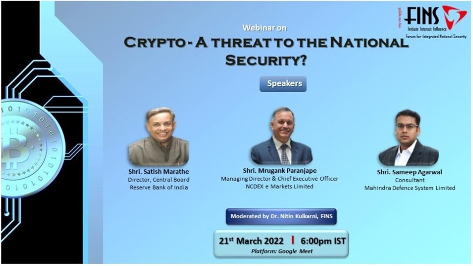 A webinar was held on March 21st, 2022 on a Topic “Crypto- A Threat to the National Security”? The webinar was in the form of Panel Discussion with three eminent persons from the Banking, Financial markets and cyber world namely Shri. Satish Marathe, Shri. Mrugansh Paranjape and Mr. Sameep Agarwal participated as speakers.