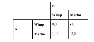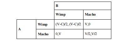 Remember our 1950s youths racing their cars towards one another and seeing who will be the first to swerve to avoid a collision? Now we suppose the players have no choice in the matter” each is genetically hardwired to be either a Wimp (always swerve) or a Macho (always go straight). The population consists of a mixture of the two types. Pairs are picked at random every week to play the game. Figure below shows the payoff table for any two such players – say, A and B