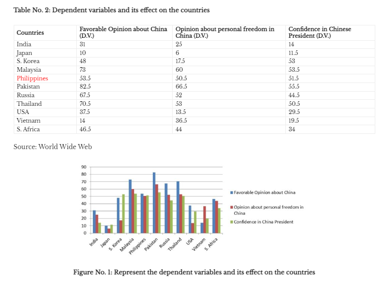 The objective of the study is to assess the Dragon’s soft power in the current context. The study is explanatory in nature based upon secondary data with use of simple statistical technique of correlational analysis. The data for the current study collected is through desk & World Wide Web research and the study is purely based on secondary resource. Considering the past experience & knowledge of the authors in the current subject and selective literature review, it is highlighted that, the favorable opinion about China, opinion about personal freedom & confidence in Chinese President are considered as a dependent variable for the study.