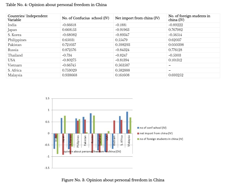 The leading democratic countries such as India, US, S. Korea, Thailand have shown a negative correlation in terms of dependent variable considering three independent variables. While countries sometimes in their life span, experience the Unitary Presidential regime such as Pakistan, Philippines, Malaysia has shown a positive correlation for the dependent variable i.e., personal freedom in China. The third group of countries where there is mix correlation for dependent variable with respect to independent variable, these countries are Russia, Japan, Vietnam, the reason attributed to this could be the issue-based reaction for the dependent variable i.e., opinion about personal freedom about China.