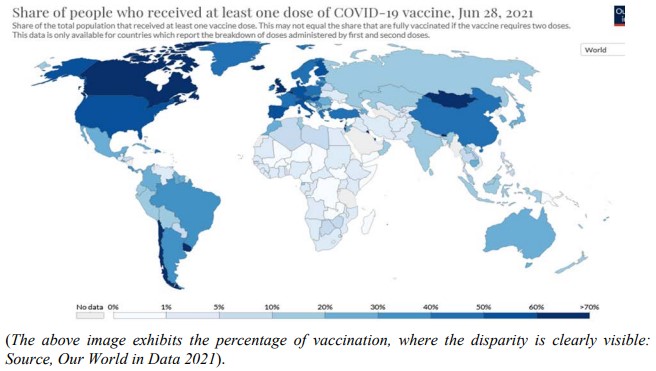 Of course vaccine disparity has been linked to vaccine nationalism and even wealthier states are facing the brunt. Take for instance the position of Australia which is still dependent on supplies from abroad and complained that Astrazeneca is not able to live up to its obligations in addition to supplies being blocked by the EU (BBC, 2021). Sounding a similar tone, newly elected WTO chief Ngozi Okonjo-Iweala said that vaccine nationalism and protectionism by the means of which certain states block supplies or are more concerned about intellectual property rights could cause slowing down the pace of vaccinations, and unless every state has been vaccinated properly there would be no recovery (Josephs. 2021). While health experts have repeatedly warned that unless a complete immunisation is done with respect to all the states in the world, the dreams of a recovery is distant. While richer nations have already pre-booked their shots and while 45 percent of the global vaccines have been administered to just 16 percent of the global population, around 92 countries will not be able to reach their effective target of vaccinating at least 60 percent of their population by late 2023 (Kretchmer, 2021). This shocking disparity leaves out most of the countries, and with new mutations on the rise there is no end to the pandemic that originated in Wuhan. Figuring out this sharp contrast, while 54 percent of the global doses have been bought by the wealthier nations, only 3 percent of such doses have fallen into the hands of its diametric opposite, additionally higher income states could possibly vaccinate their population twice whereas the lower incomes states may cover one a third.