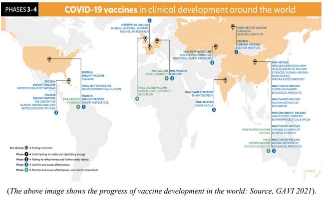 The initial response from the international community was not only on an emergency basis, but also exposed the soft underbelly of the developed nations with famed health infrastructures. It also exhibited how inadequate were the preparations of those states that are woefully short of funds and effective planning. A glimmer of hope arose as scientists all over the world raced to find a proper vaccine and a cure (WHO. 2021). Faced with unprecedented challenges and with the entire global health system on the verge of a collapse, the international scientific community realised that the only way to prevent more damage was to create an efficient vaccine. It would however be a mistake to only discuss the vaccine development as a response to the recent pandemic originating in Wuhan, indeed the previous SARS epidemic that swept across the PRC and some Southeast Asian states in 2003 (The Guardian, 2003) was the initial impetus for a robust vaccine development programme. Since the Wuhan virus is almost similar to its predecessor1 scientists believed that by following the same pattern of vaccine development which includes the study of the viral protein and gene, identification of a proper and effective antigen, the route required for immunisation , animal response study, immune response study, clinical trials and the most dangerous- the human trials. The methodology taken by the scientists also determine the time frame required to develop vaccines which may take anywhere from a couple of years to a longer period. Scientists also realised that rushing through the entire procedure would be fraught with miscalculations and risks. Under these pressing circumstances, they focussed on three ways of developing vaccines which included a first generation (live attenuated and inactivated vaccine), second generation (protein subunit and vector base vaccine) and the third generation (nucleic acid and nano-material based vaccine) (Badgujar, 2020). The WHO in an informative article explained the process of development of vaccines, the ratio of success is quite low as only 7 out of 100 candidates will found deemed to move on to the next phase, out of which just 1 in 5 will be considered fit enough to move on to the phase of clinical trials. This feature exhibits that since the ratio of success is quite low, the race for finding a proper vaccine becomes even more cumbersome (WHO. 2021).