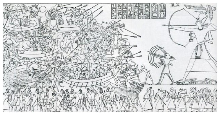 Scene from an Egyptian temple wall shows Ramesses' combined land and sea victory in the Battle of Delta. Source: https://en.wikipedia.org/wiki/Naval_warfare#/media/File:Seev%C3%B6lker.jpg