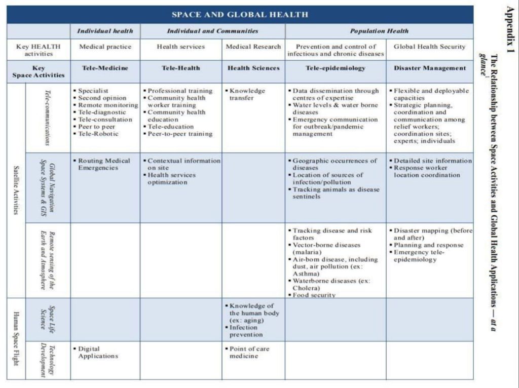 Various national and regional space agencies of the major space faring nations have initiated the programmes to leverage their outer space capabilities.The Expert Group on Space and Global Health identified four key technological domains that are applied or could be applied to global health, such as remote sensing, GNSS/GIS, satellite communications and human space flight.A range of subdomains that emerged with these cross-domain applications of space technologies can be listed as Telemedicine and telehealth, Tele-epidemiology and environmental health, space life sciences, Disaster and health emergency management. Despite the existence of the technology for decades, the potential of the existing space technologies still remains unutilised to its optimum level.