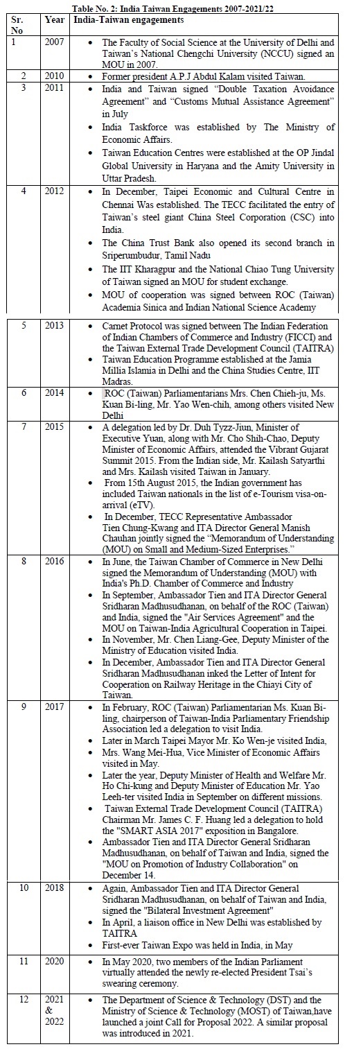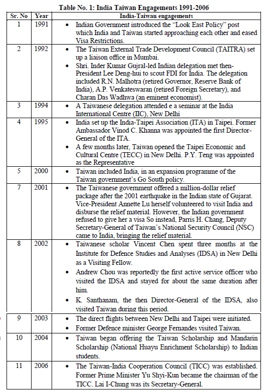 The bilateral relations between the two countries were established in the 1930s when Shri. Jawaharlal Nehru visited China in 1939 as an honored guest of the ROC government. The relations further developed with the Visit of Chiang Kai-shek and his wife Song Meiling to India in 1942. The relations between the two countries faded subsequently due to India’s recognition to PRC in 1950 and recognizing the island of Taiwan was a part of Chinese territory. Post-1991 India not only experienced the economic crisis but also witnessed the collapse of the USSR with whom it had trade and economic ties. To leverage its position in the dynamic Asia-Pacific region, the Look East Policy was useful so to be part of an economic hub that was emerging in the Asia-Pacific region and in particular East and South East Asia. The regional economies of Asia Pacific were an attractive source of foreign direct investment (FDI) for India. The growing economies of East and South East Asia could be India’s future export markets. In order to search for markets and investment, the Look East Policy unveiled by Prime Minister PV Rao, provided the launch-pad. Prime Minister PV Rao overturned India’s longstanding reticence to dealing with ASEAN and actively sought closer links with Japan, the Republic of Korea, Taiwan, and member nations of ASEAN.3 The emphasis of the Look East Policy (LEP) was to build bridges with countries such as Japan, the Republic of Korea, Taiwan, and the member countries of ASEAN so to stabilize India’s external economic profile and accelerate the rate of economic growth. The changes in Indian foreign policy post-1991 were defined by economic development and to reintegrate into the world economy. The inclusion of Taiwan in LEP was important from India’s point of view was important concerning the political and security concerns about China. In 1995, India established unofficial ties with Taiwan and since 1991 it had many engagements with Taiwan as mentioned in Table No. 1