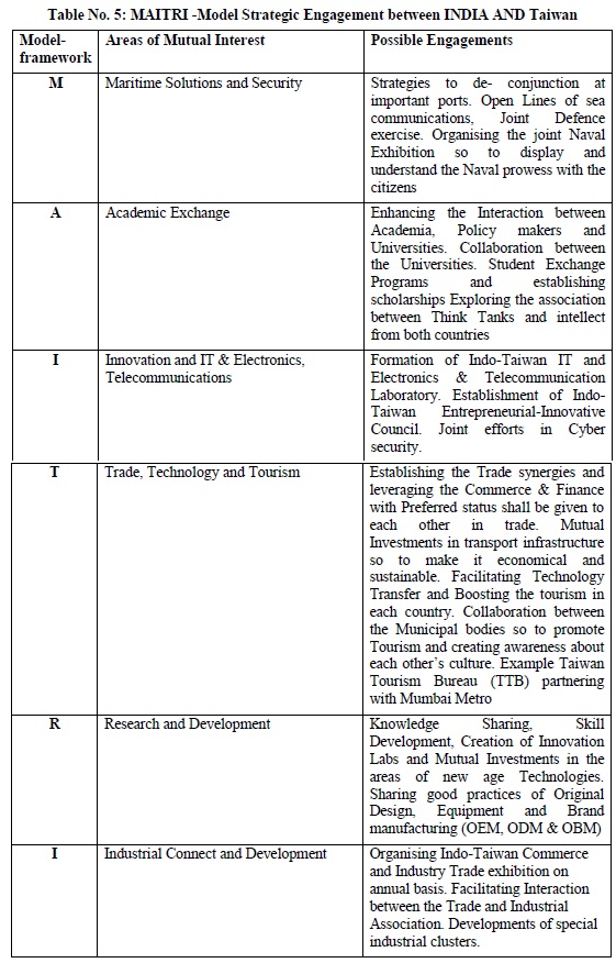The MAITRI-Model provides a common framework for the sustainable INDO-Taiwan Strategic Engagement in the suggested areas where both countries share a common interest. The model is sustainable as it would augment each other’s competitive and comparative advantage so to get maximum mutual benefit. The common areas of the MAITRI Model is elaborated in Table No. 5