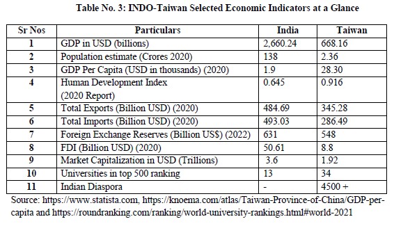 Vijay Gokhale, the then director-general of the India-Taipei Association emphasized that despite having a no political interactions, the economic interactions between India and Taiwan are based on the idea that Taiwan needs a market to grow, and India can be such a market. (Ting-I Tsai 2016)9 The mutual need may drive future strategic engagements between India and Taiwan. Though the distance between Mumbai and Taipei is more than 5,000 kilometers, but on any digital maps, these cities are neighbors. The region between the two countries is of utmost importance. 80 percent of the seaborne oil, one-third of the LNG and more than 50 percent of the world’s maritime trade passes through the region which separates India and Taiwan. It is very important that the two countries shall have a mutual association through strategic engagement so to strengthen the relations between the two countries. Table No. 3 indicates a brief comparison of economic indicators pertaining to both countries India and Taiwan. It explains the closer engagements between the two countries with strong economic and financial fundamentals. Such engagements prove to be productive in longer duration considering the big Indian market and high-end Technology available with Taiwan.