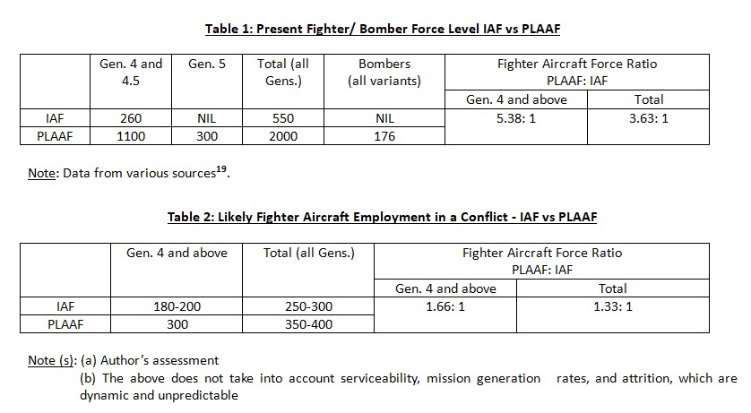 There is a general tendency to resort to bean counting in assessing the power or potential of militaries. Force-level or military hardware gives an idea of a nation’s military strength but is only one measure of its effectiveness. Military power and effectiveness include intangible factors like material/diplomatic support from friendly countries, national strategy, leadership, training, and morale. Even in the tangible factors such as platforms, the quality and quantity vary, as well as their performance in simulated/ actual combat. Another crucial aspect in air operations is the sortie generation rate. It is defined as the number of mission-capable sorties an aircraft can launch in a span of 24 hours. The serviceability of aircraft and the ability to undertake quick repair, replenishment, refueling and rearming decides the sortie generation rate. As explained earlier, the quality and availability of suitable infrastructure, technology and importance given to air power in the national security calculus are important factors. Neither the IAF nor PLAAF can deploy their entire air power capability against each other, given that both have adversaries on other fronts. The tables below depict the present force level and estimate the likely numbers lined up against each other at the outbreak of hostilities.
