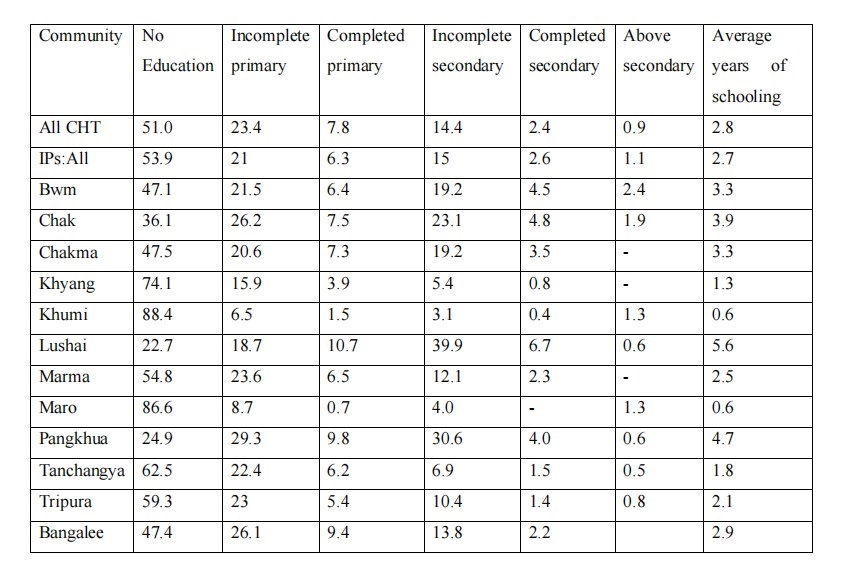The 8th constitutional amendment in 1988, which declared Bangladesh as Islamic state made religious minorities more vulnerable than ever. Since then, religion is used statesmen to legitimize their autocratic rule (Guhathakurta, M. 2012). Moreover, marginalization of minorities in every walk of life led to the feeling of alienation. In order to have a healthy and inclusive society, a state must be a secular one. No citizen of the state should feel that particular religion or culture is superior to other culture or religion. Religion is private matter, and it should be treated equally in the eyes of the government as well as before the law. There is reservation for women in Jatiya Sangsad of Bangladesh, but we do not find women representative from minority communities in it. Does it mean that there is no worthy woman from religious minorities to be a member of Jatiya Sangsad? The present situation has become worse for the minorities. The minority communities just want safe life in Bangladesh. Political representation is far to them. The major opposition political parties, religious based groups in Bangladesh have consolidated their power on the basis of religion. And the minority communities because they are less in number, cannot win in elections. Religion remains the dominant factor in the domestic politics of Bangladesh. When we debate the identity politics, particularly in multi-cultural society like Bangladesh, it is not an easy task to get it back. Looking back to history it is a well-known fact that Bangladesh was part of secular India. Destroying the temples and Viharas of Buddhist origin are examples to prove it. The identity of non-Muslims is trashed time and again in Bangladesh by killing and murdering the nonMuslims. No one in the world like to live without self-respect; even an imprisoned accused needs respect. And here the question is of a million people who are free but for name’s sake, they are in continuous threat of losing their life if they revolt to earn their snatched identity. Therefore, the major political parties in Bangladesh needs to change their behavior towards the minorities and give proper representation in all walks of life to the religious community including women from minority communities so that they could address their problems confidently. In the field of education, Bangladesh Government has many boards of secondary and higher secondary education, e.g. Madarsa education board, Sanskrit and Pali education board etc. At present the board receives only one lakh rupees annually The board was running its business in a house which was on rent for 1500 (Azad, S. 2005). The following table shows how the pessimistic approach of the government affected the education of the Buddhist tribal people which further affected their economic status