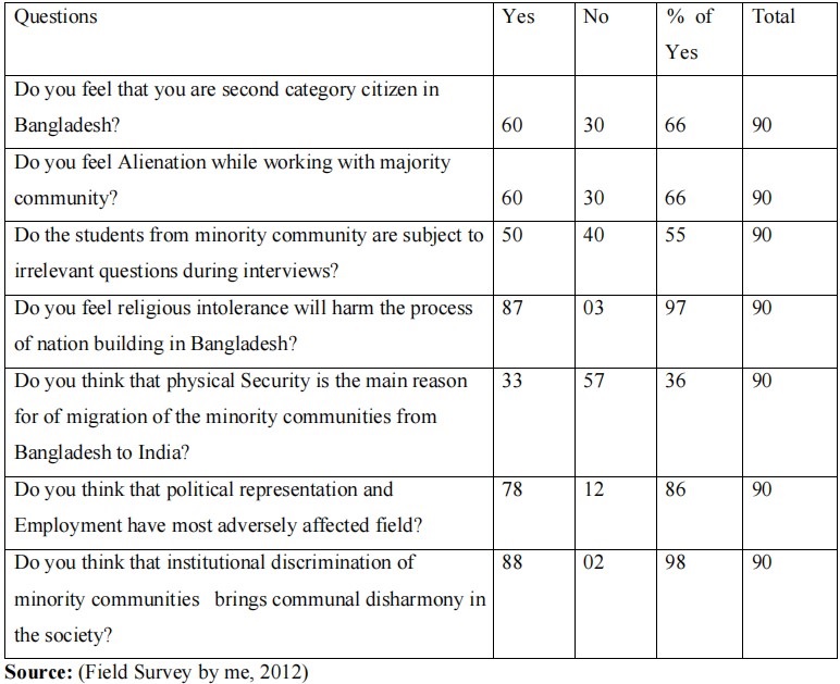 So, this kind of attitude creates distrust and rift between minority and majority communities. Further, 96 respondents said religious intolerance will harm the process of nation building. Religious tolerance is a necessary condition for nation building in general and newly emerging country like Bangladesh in particular. The reason for physical insecurity for the migration of minority communities from Bangladesh to India remains the least discourse. Only36 per cent of respondents said yes to the reason. Along with the physical insecurity, the other reasons like economic opportunities, education, and employment are also important. From the above facts the hypothesis has been proved true, that the institutional discrimination brings communal disharmony in society