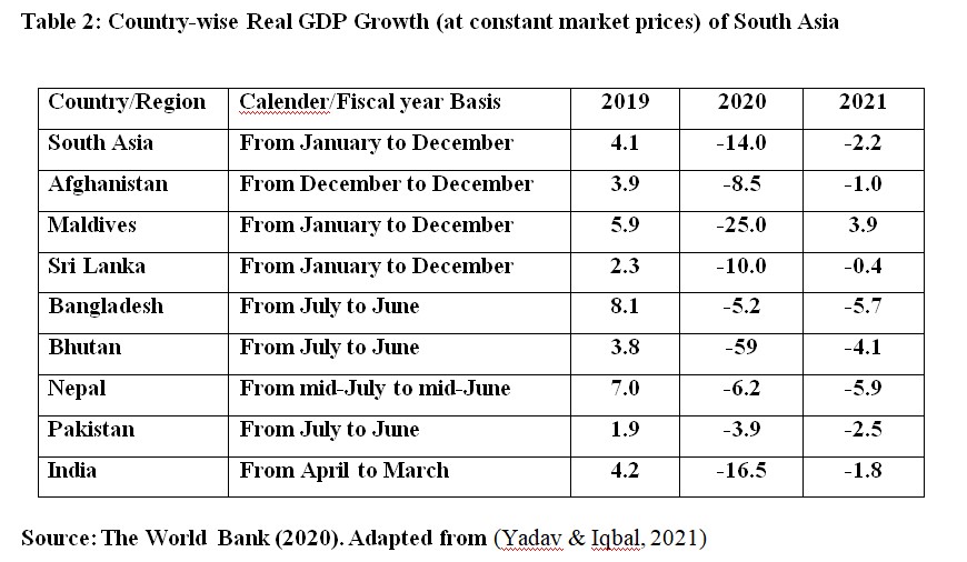In South Asia, each country had its fair share of economic contractions during the pandemic. Like the rest of the world, the region resorted to nationwide lockdowns to contain the virus, which led to a severe economic hazard. The pandemic affected the region's formal and informal economies as lockdowns in every country created mass unemployment, pushing millions of people to the Below Poverty Line (Younus, 2021). Before the pandemic, the countries of South Asia had a steady growth in the economic sector. In fact, according to The World Bank data, the macro scenario of the per capita GDP of South Asian economies was one of the highest during the period of 2015 to 2019, with India and Bangladesh having the highest per capita GDP growth (Yadav & Iqbal, 2021). India, being the largest economy in the region progressed rapidly with private investment and more lavish consumer spending; Bangladesh was growing through the export of garments; Bhutan, with its clean energy and hydropower reserves; and Nepal, Sri Lanka, and Pakistan, with several economic reforms were on the path of growth (Yadav & Iqbal, 2021). The pandemic put a break on these developments and halted economic growth significantly in the following years.